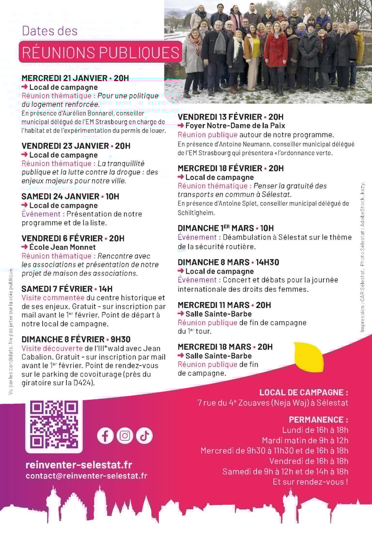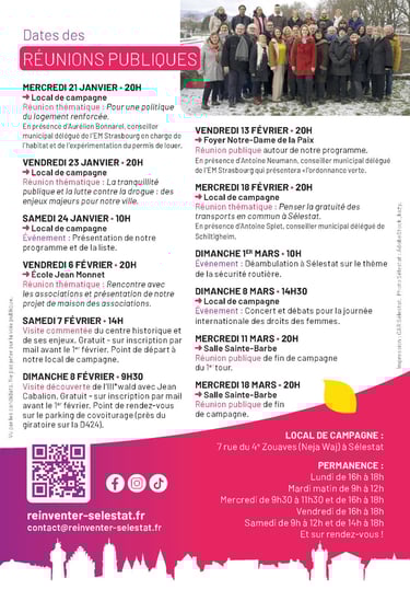 Nous voulons faire de Sélestat une ville responsable et engagée, mais aussi une ville rayonnante et ouverte, fière de son identité et résolument tournée vers l’avenir. Une ville qui protège, qui rassemble et qui donne à chacune et chacun les moyens d’y vivre dignement, de s’y émanciper et de s’y épanouir.